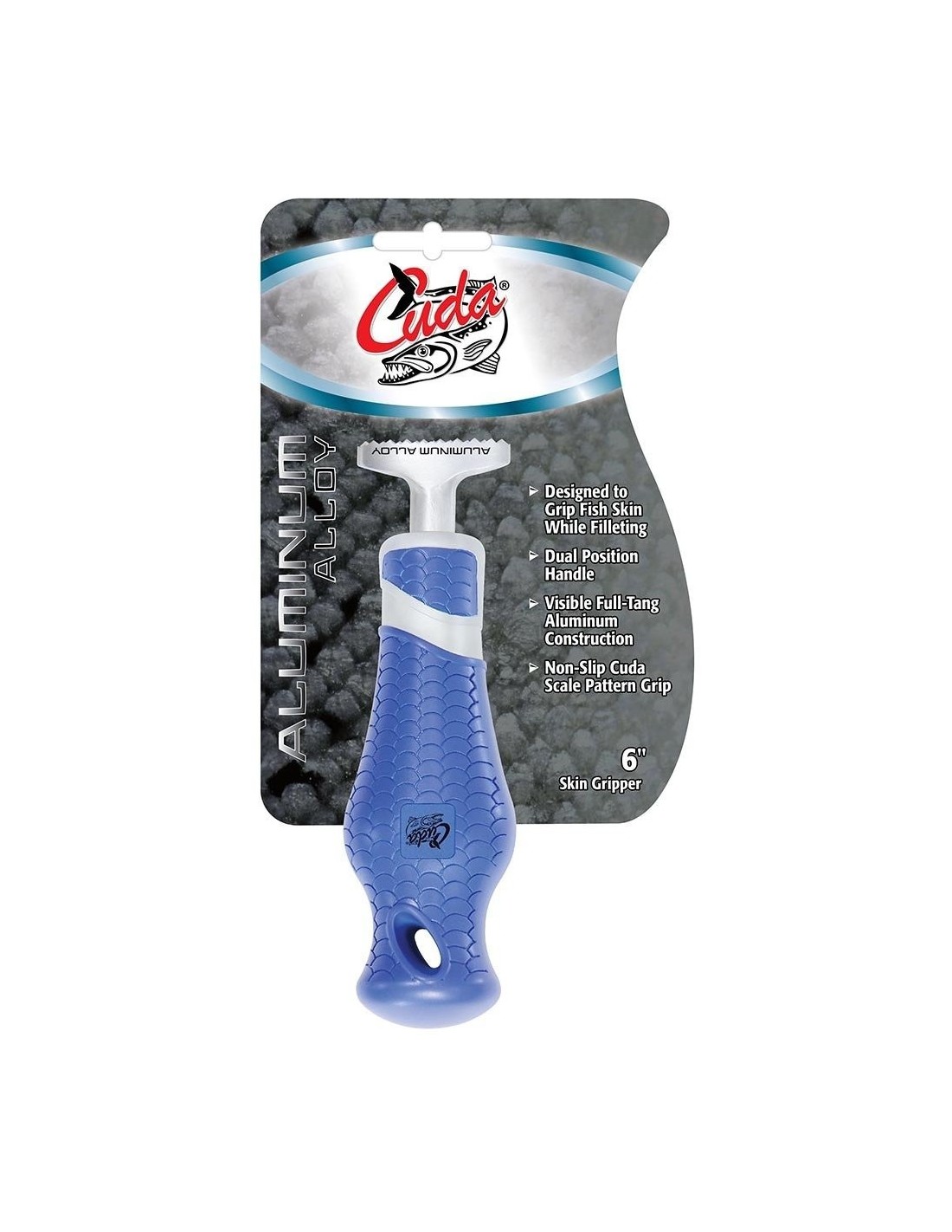 Der Cuda Fischhautgreifer 6" ist sehr nützlich beim Filetieren. Beim Filetieren eines Fischfilets ist es of sehr mühsam, den Fisch zu fixieren, ohne das Fischfilet zu beschädigen. Mit dem Cuda Fischhautgreifer 6" fixiert man das Ende des Filets mühelos auf der Arbeitsplatte, um ein sauberes Filet schneiden zu können. Der ergonomische Griff liegt besonders gut in der Hand, wobei die spezielle, gummierte "Fischschuppenoberfläche" einen super Gripp bietet und das Abrutschen verhindert.