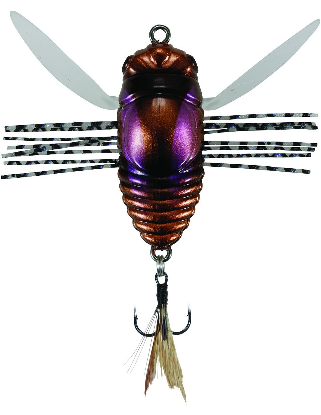Durch den harten Körper erzeugt er auf dem Wasser dasselbe Geräusch wie eine Zikade. Die weichen Beinchen an beiden Seiten erzeugen die gleichen feinen Schwingungen wie die einer echten Zikade. Die aus Elastomer gefertigten Flügel (welche fest mit dem Körper verbunden sind) funktionieren wie ein Stopper und erzeugen starke Druckwellen beim Einkurbeln des Köders, was sehr verführerisch wirkt.